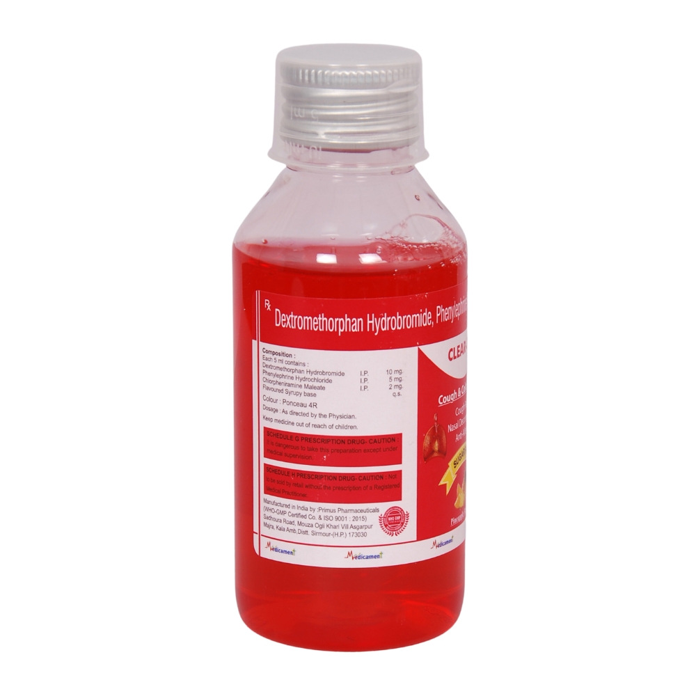 Clear DX is a Sugar Free Syrup 100 ml contains (Dextromethorphan Hydrobromide 10mg)+ Phenylephrine 5mg + Chlorpheniramine Maleate 2mg): Each 5ml syrup belongs to a class of medication called 'cough and cold preparations' primarily used to treat dry cough. Coughing (dry or productive) is the body's way of clearing irritants (like allergens, mucus or smoke) from airways and preventing infection. There are two types of coughs, namely: dry cough and chesty cough. A dry cough is tickly and mucus, while a chesty cough (wet cough) produces mucous or sputum. Relieves cough and other symptoms associated with upper respiratory tract infections like common cold or allergies