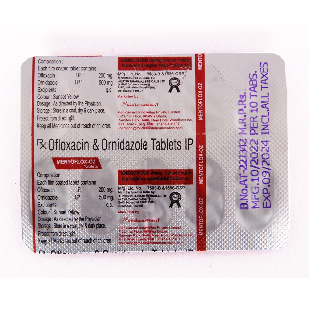 Mentoflox contains Ofloxacin (200mg) + Ornidazole (500mg), is a combination of two antibiotics. It is used in the treatment of bacterial and parasitic infections. It effectively treats a wide range of bacterial infections that may occur in the teeth, lungs, gastrointestinal infections, urinary and genital tract.