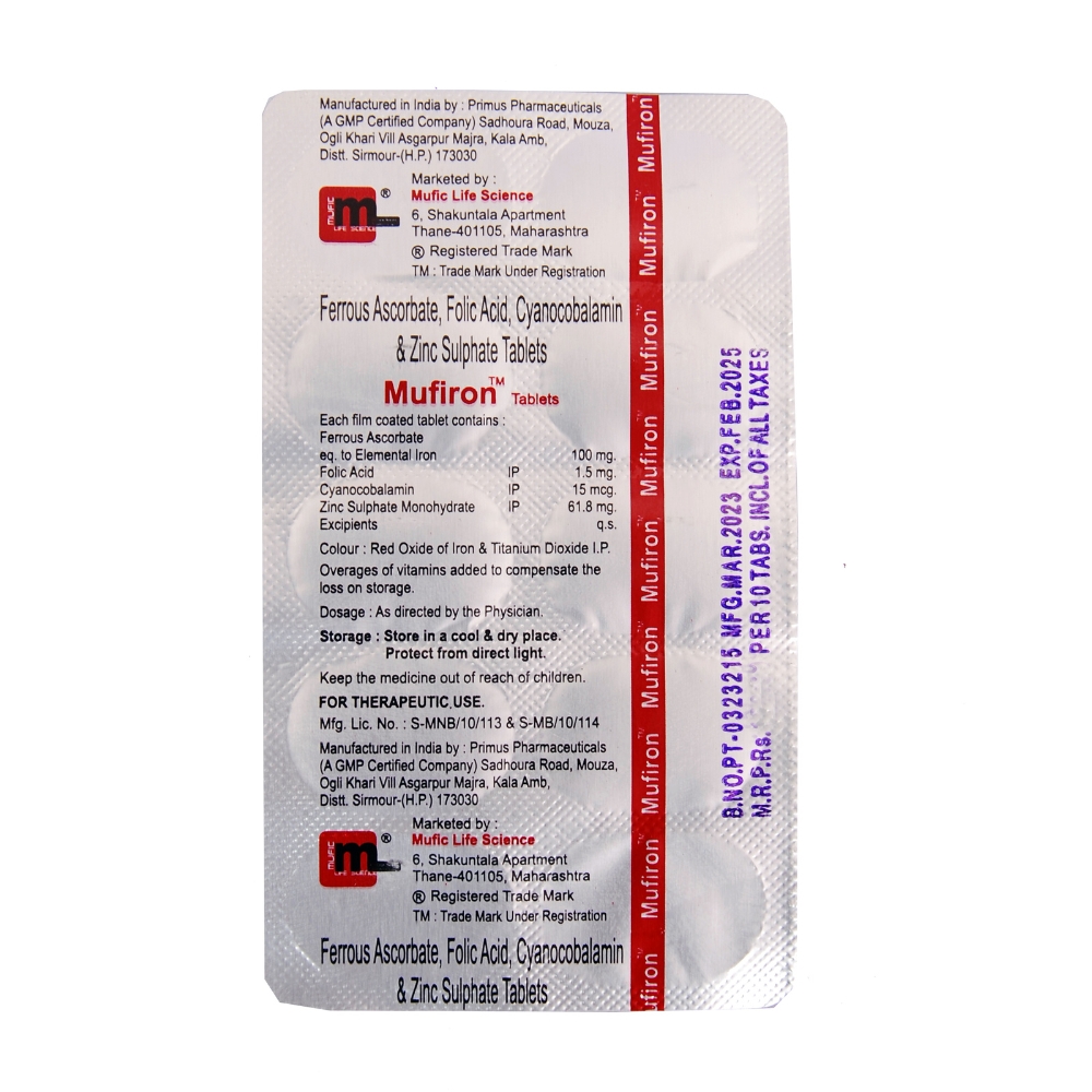 MUFIRON: Each capsule contains (Ferrous ascorbate 100mg+ Folic acid 1.5mg+ Cyanocobalamin 15 mcg and zinc sulphate 61.8mg tablet) is primarily used to prevent and manage nutritional deficiency anemia related to folic acid and iron deficiency. FERROUS ASCORBATE+FOLIC ACID is essential to take during pregnancy to maintain correct levels of iron and folic acid and reduce the risk of neural tube defects in babies. It can help increase red blood cells and folate levels in the body. It may also aid in oxygen transportation and hemoglobin formation for increased energy and metabolism. Elemental Iron is essential for blood production and is an important content of hemoglobin and use to manage iron deficiency anemia.